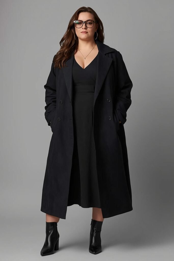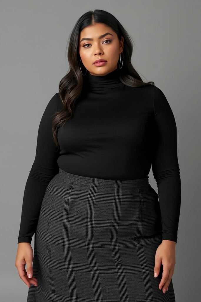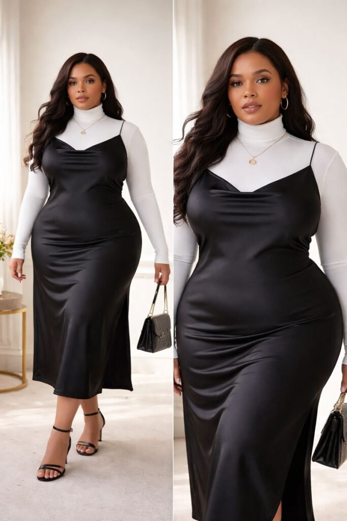 Layering a fitted turtleneck under a midi slip dress adds both warmth and dimension. This layered style is a must-try among plus size fall outfits for winter, especially when paired with knee-high boots with an eye-catching belt for extra style.