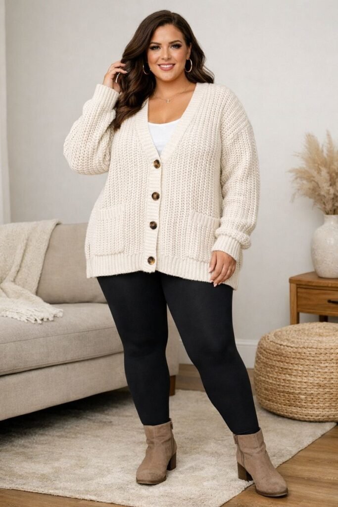 A chunky cardigan over a simple top and leggings is one of the easiest ways to stay cozy while looking stylish. For plus size fall outfits for winter, belting the cardigan helps define the waist and maintain a flattering silhouette. To finish the outfit, use ankle boots.