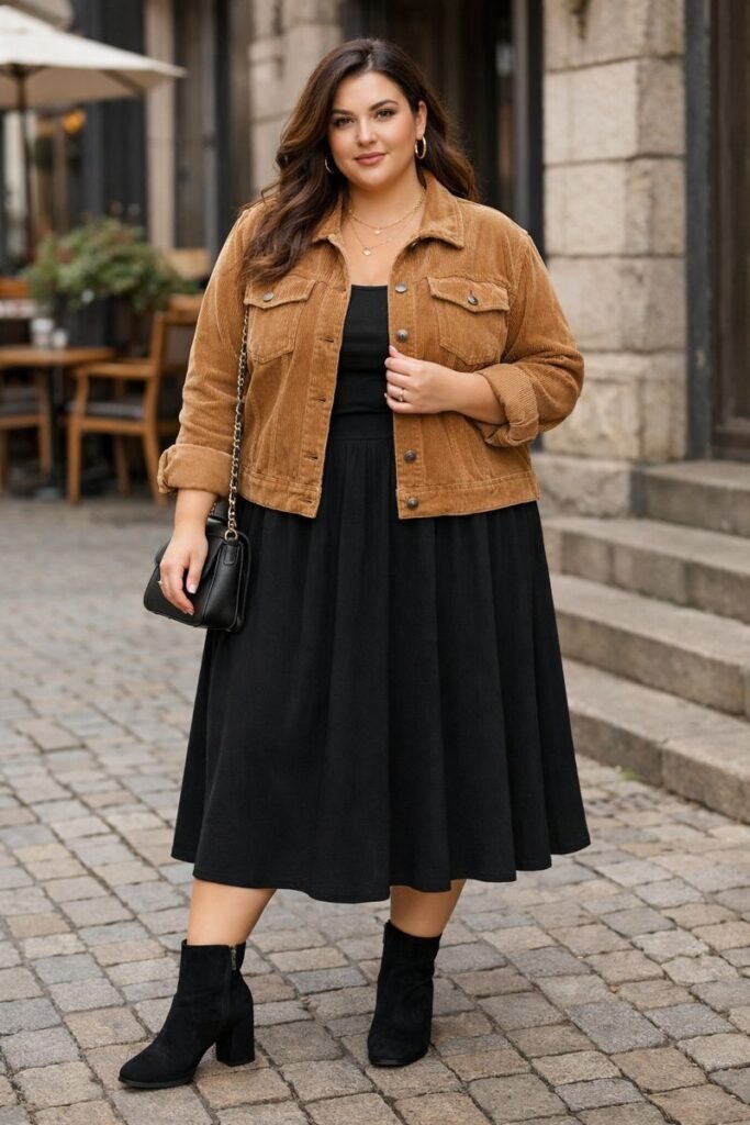 A corduroy jacket paired with a flowy midi skirt offers texture and warmth for fall and winter. Add tights and boots for a practical winter outfit. Layer with a longline cardigan under the jacket for extra insulation while maintaining style.