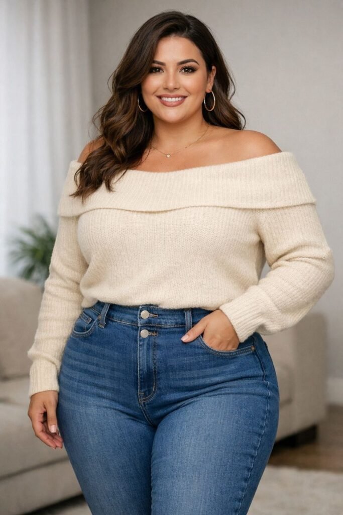 An off-shoulder knit sweater paired with high-waist jeans creates a flattering silhouette and draws attention upward. Pair with ankle boots and a cozy scarf for a balanced winter outfit. Layering with a structured coat completes this effortlessly chic ensemble.