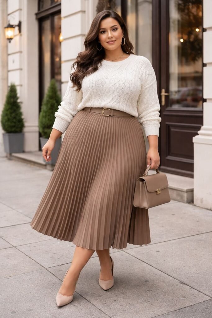 A cable-knit sweater tucked into a midi pleated skirt creates a textured and feminine winter outfit. Pair with ankle boots and a longline coat. Layering with patterned scarves adds interest and warmth, perfect for curvy winter fashion.