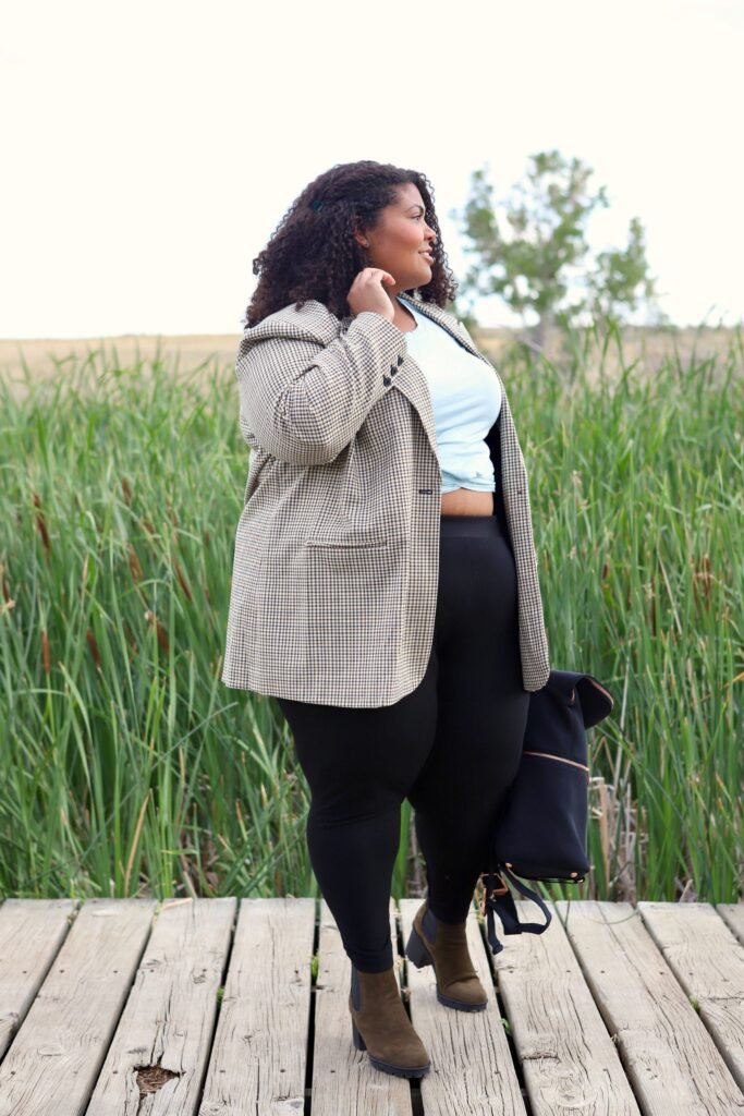 A plaid blazer adds structure and polish to any winter outfit. This combination is a smart choice for plus size fall outfits for winter, pairing the blazer with wide-leg trousers and a fitted top underneath. Heeled boots and a crossbody bag finish the look elegantly.