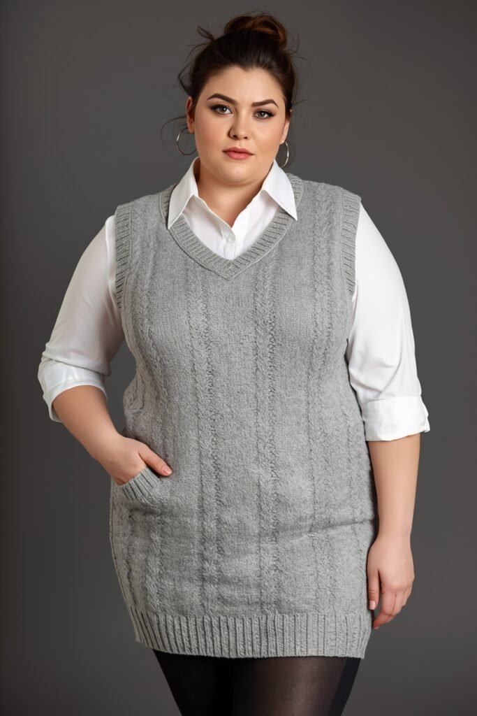 Layer a cozy sweater vest over a long shirt dress for a trendy, plus size-friendly outfit. Add a belt at the waist and pair with knee-high boots for structure. Finish the look with layered necklaces and a wool hat to complete a chic winter-ready look.