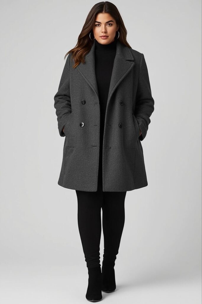 A tailored peacoat paired with bootcut jeans creates a balanced winter silhouette. Add heeled boots for extra height and a scarf for a polished touch. Gloves and a structured bag complete this timeless look for plus size winter fashion.