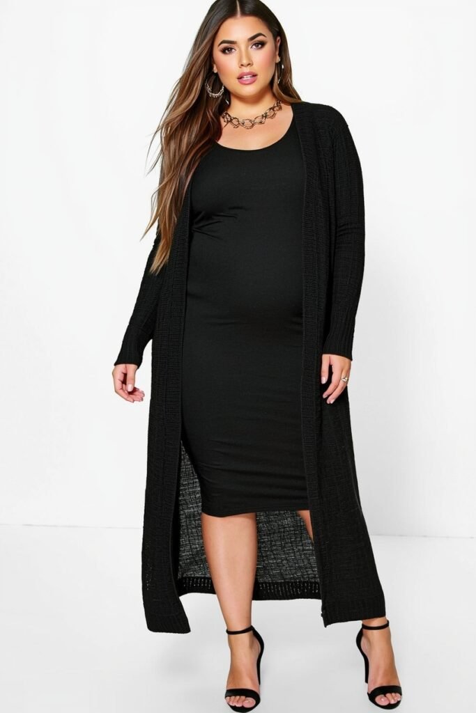 Layering a maxi cardigan over a bodycon dress adds warmth without sacrificing shape. Pair with knee-high boots for elegance and accessorize with a belt or statement necklace. This outfit is ideal for casual gatherings or semi-formal winter events.