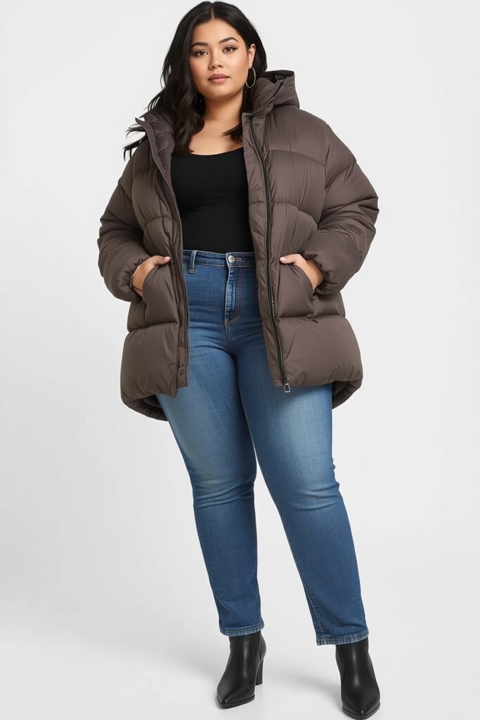 For the coldest days, a puffer coat over straight-leg jeans ensures warmth without sacrificing style. Add chunky sneakers or ankle boots, a beanie, and mittens to make this outfit winter-ready and trendy. Neutral tones and simple accessories create a clean, effortless vibe.